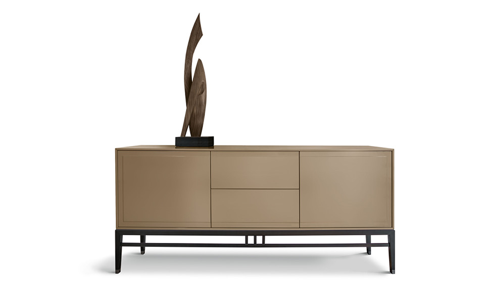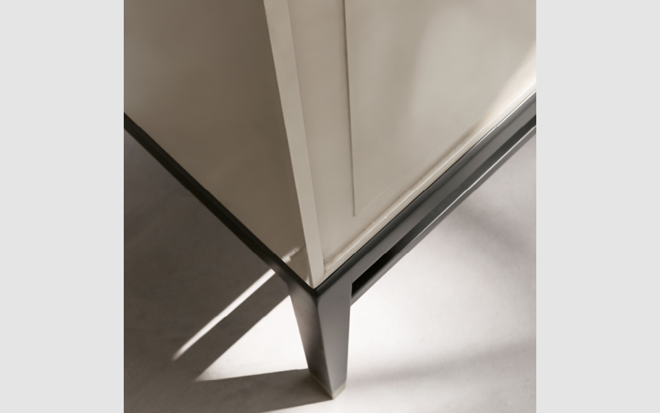 Комод с 2 боковыми дверками и 2 ящиками. Внешняя отделка в крашеном МДФ, внутренняя отделка в розовом дереве.Задник в розовом дереве. База из массива тонированного ясеня, с накладками на ножки в отделке черненый никель. Полки внутри.